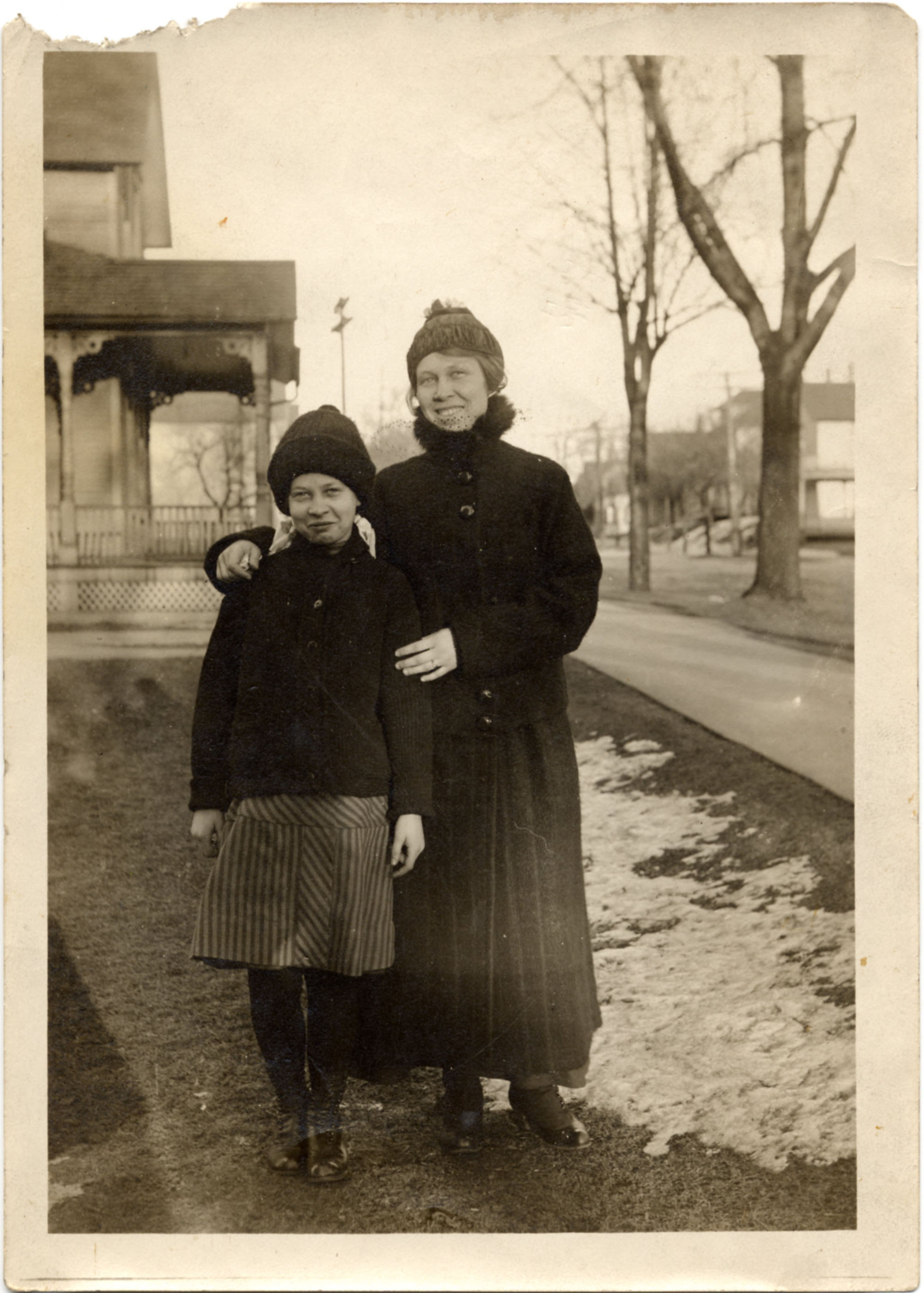 This is my 2nd Great Aunt Grace (Packer) Elliott and my Great Grandmother Cora (Packer) Shea. It was taken at the home of their parents around about the early 1920s.  I could certainly be mistaken but I think Grandma Shea is wearing a wedding band which would make it 1922 or later. Ninety percent of my earlier pictures of Aunt Grace have a very sour expression. This one’s more “trying-not-to-look-like-I-could-possibly-be-happy” and it is very similar—both due to features and the expression—to at least two of my close living relatives. Any guesses?
