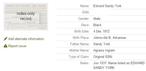 In case you missed it—and thank you Anne and Jeff for bringing it to my attention—Ancestry.com added a new and fabulous database at the end of July. The U.S., Social Security Applications and Claims Index, 1936-2007 expands on the information in the Social Security Death Index (sample to the right) including parents’ names, actual death dates; and various forms of the name (married names, middle names) used at different times in the person’s life.