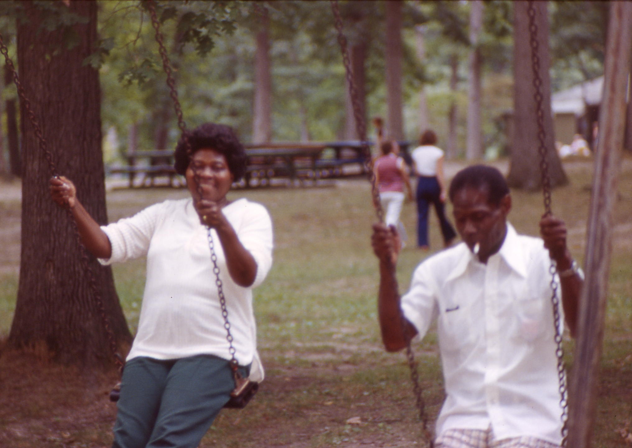 These are my grandparents Elnora (York) and Levie Trotter enjoying the swings at a Trotter-Johnson picnic outside of Potter Park Zoo in Lansing, Michigan in 1980 or 1981. It’s a bit fuzzy but it brings back fond memories.